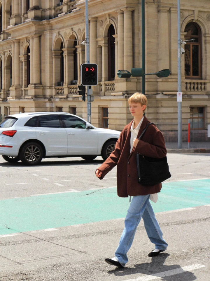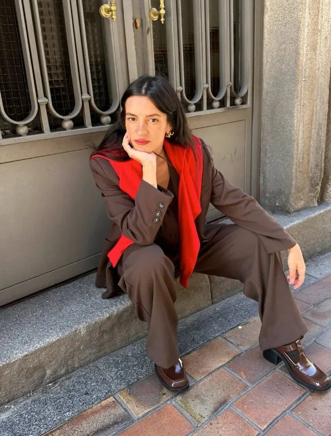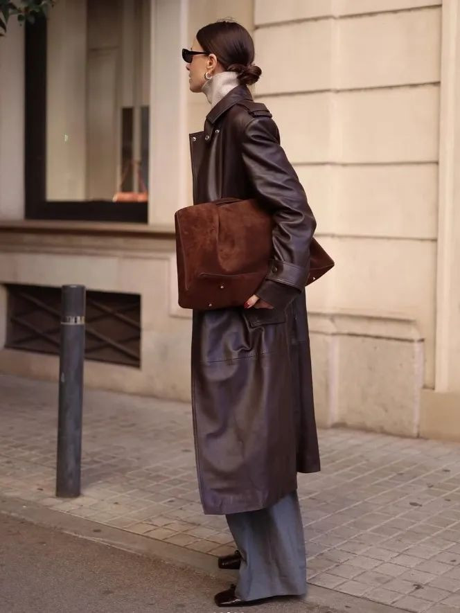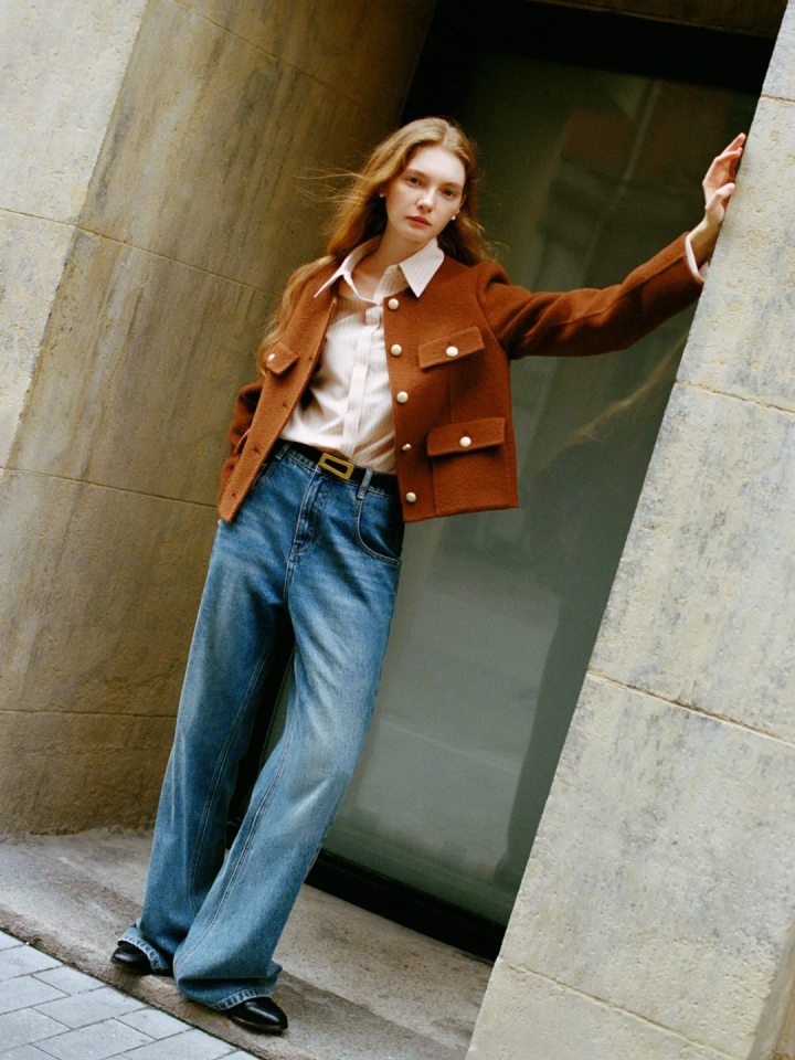 棕色廓形西装剪裁非常利落,线条流畅,能够很好地修饰身形。蓝色牛仔阔腿裤耐磨且富有质感,蓝色与棕色的搭配,既对比鲜明又不失和谐,非常吸引眼球。