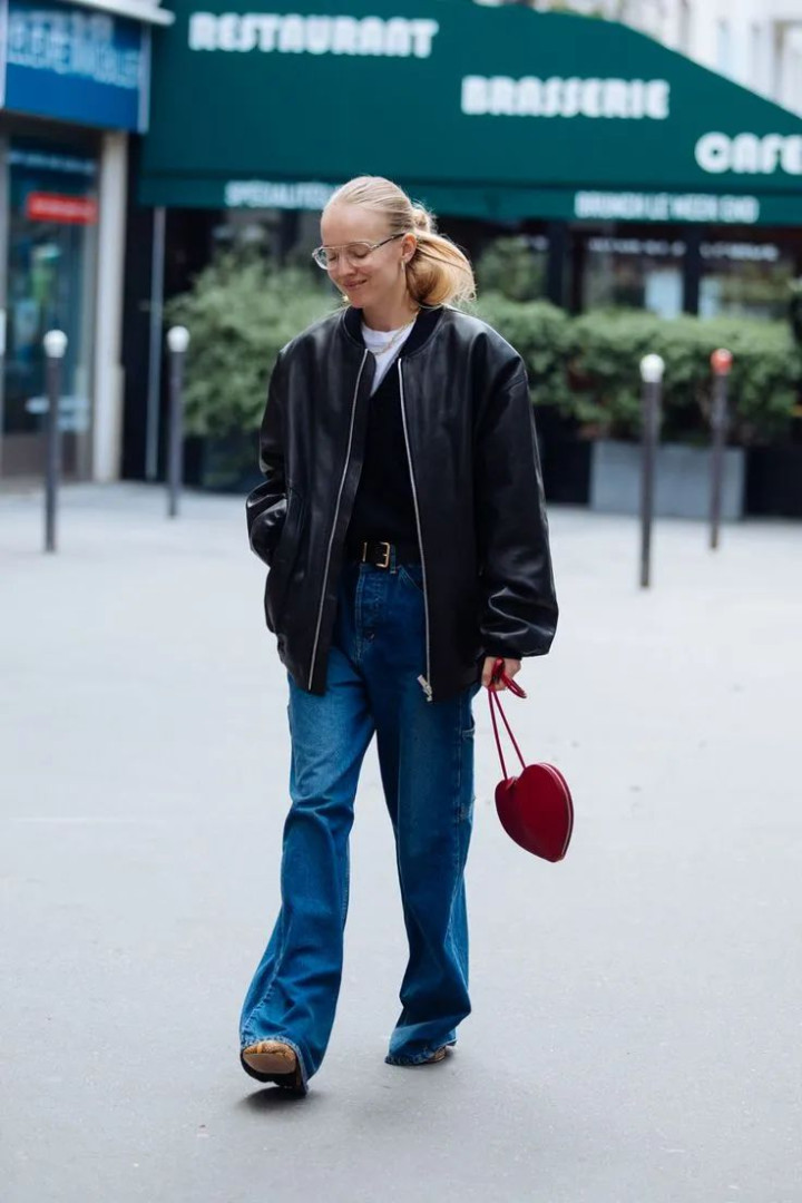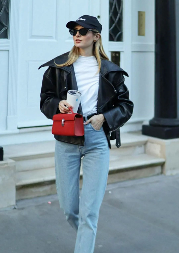黑色皮夹克配蓝牛仔阔腿裤,可以搭配一条黑色腰带点缀,显得更加硬朗帅气,配一个红色包包撞色,穿出你的高级感。