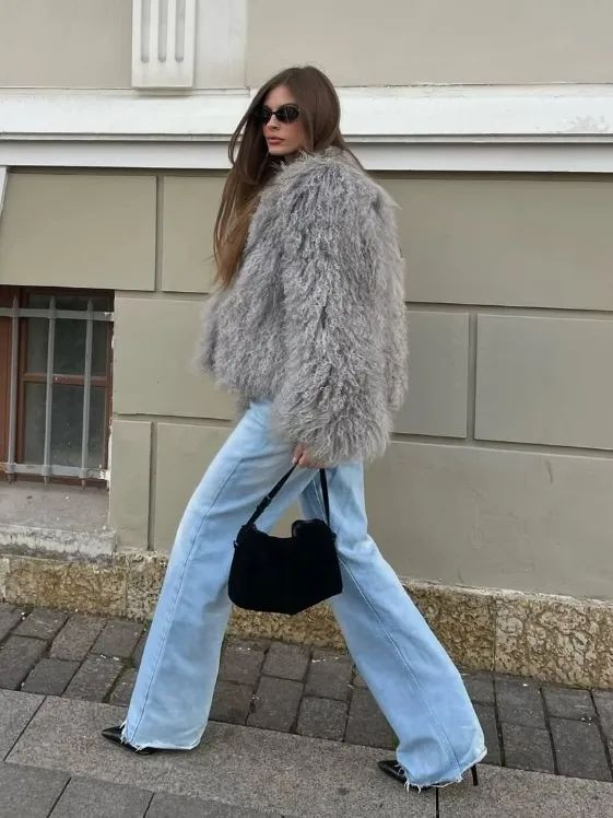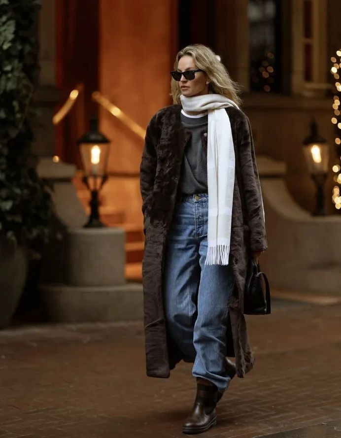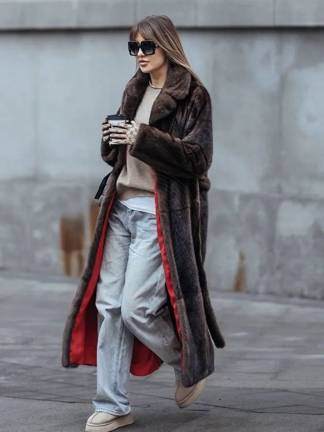 深棕色皮草大衣可以内搭浅棕色毛衣,毛衣里面叠穿一件白色T恤衫,下身配一条淡蓝牛仔阔腿裤,可以中和一下大衣带来的厚重感,脚踩一双浅棕色雪地靴,正好和毛衣呼应起来。