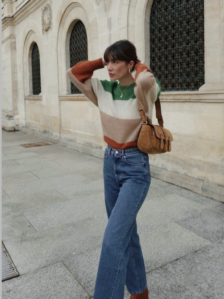 彩虹色条纹毛衣搭配一条复古蓝牛仔阔腿裤,再配上一款简约的斜挎包或手提包,就能轻松出门啦!
