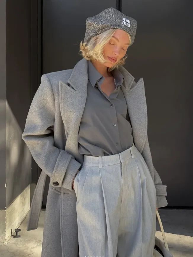 全身同色系搭配更容易拿捏,比如一身灰的组合。通过塞衣角来突显出高腰线。