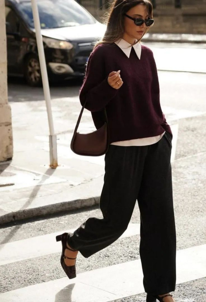 穿深色毛衣配黑色高腰阔腿裤时,可以在毛衣里面叠穿一件白色衬衫,露出衬衫领口、衣摆,增添几分清爽气息,更加减龄衬肤色。