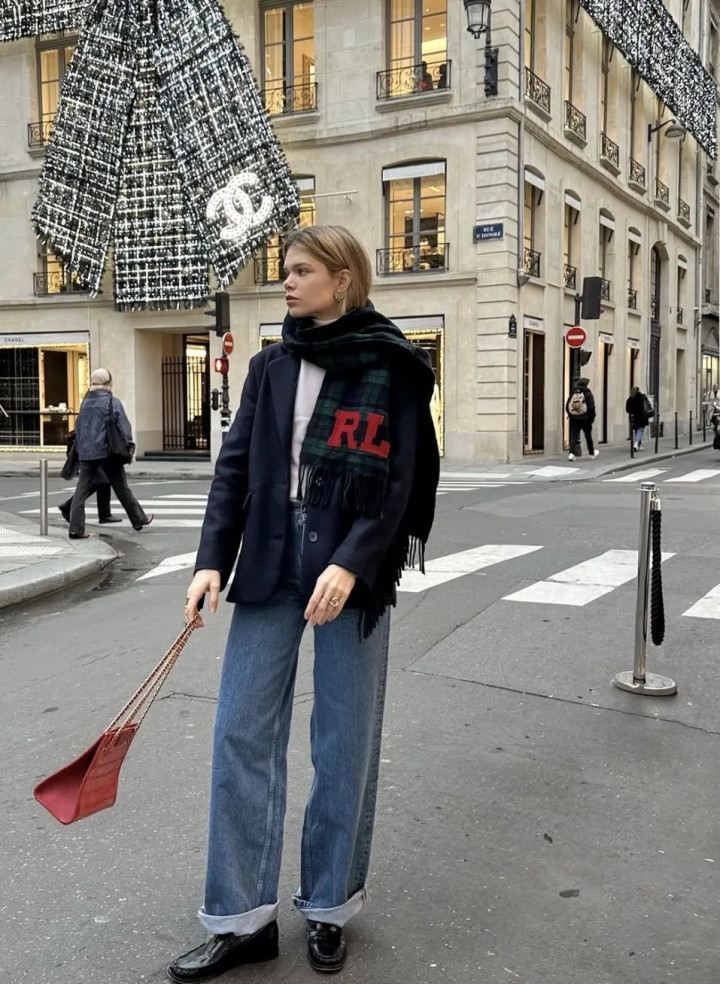 穿蓝牛仔阔腿裤时,可以配一个红色包包撞色,尤其是上半身搭配了深色西装,可以起到提亮吸睛的效果。