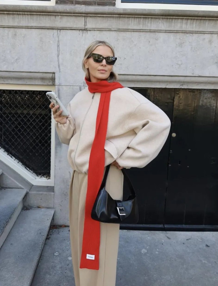 如果你有一件暗红色皮夹克,就可以内搭灰色毛衣,再搭一条灰色牛仔阔腿裤,线条流畅,配一条灰色围巾,xiande