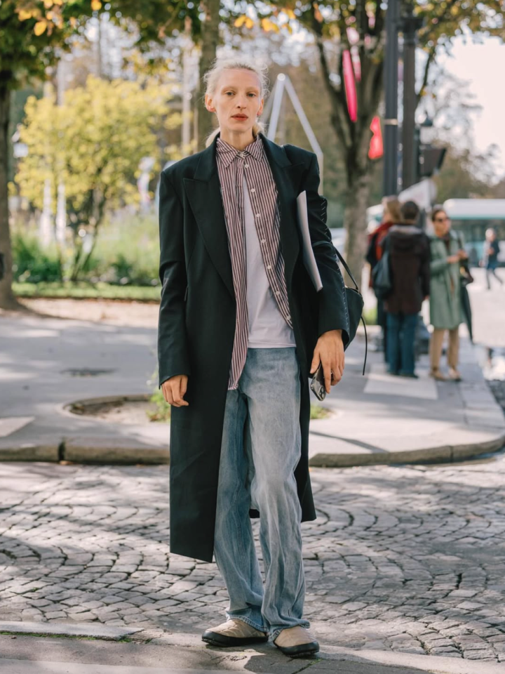 大衣+衬衫+T恤衫的组合,作为中间层的衬衫可以选择条纹款,简繁结合,显得更加松弛。